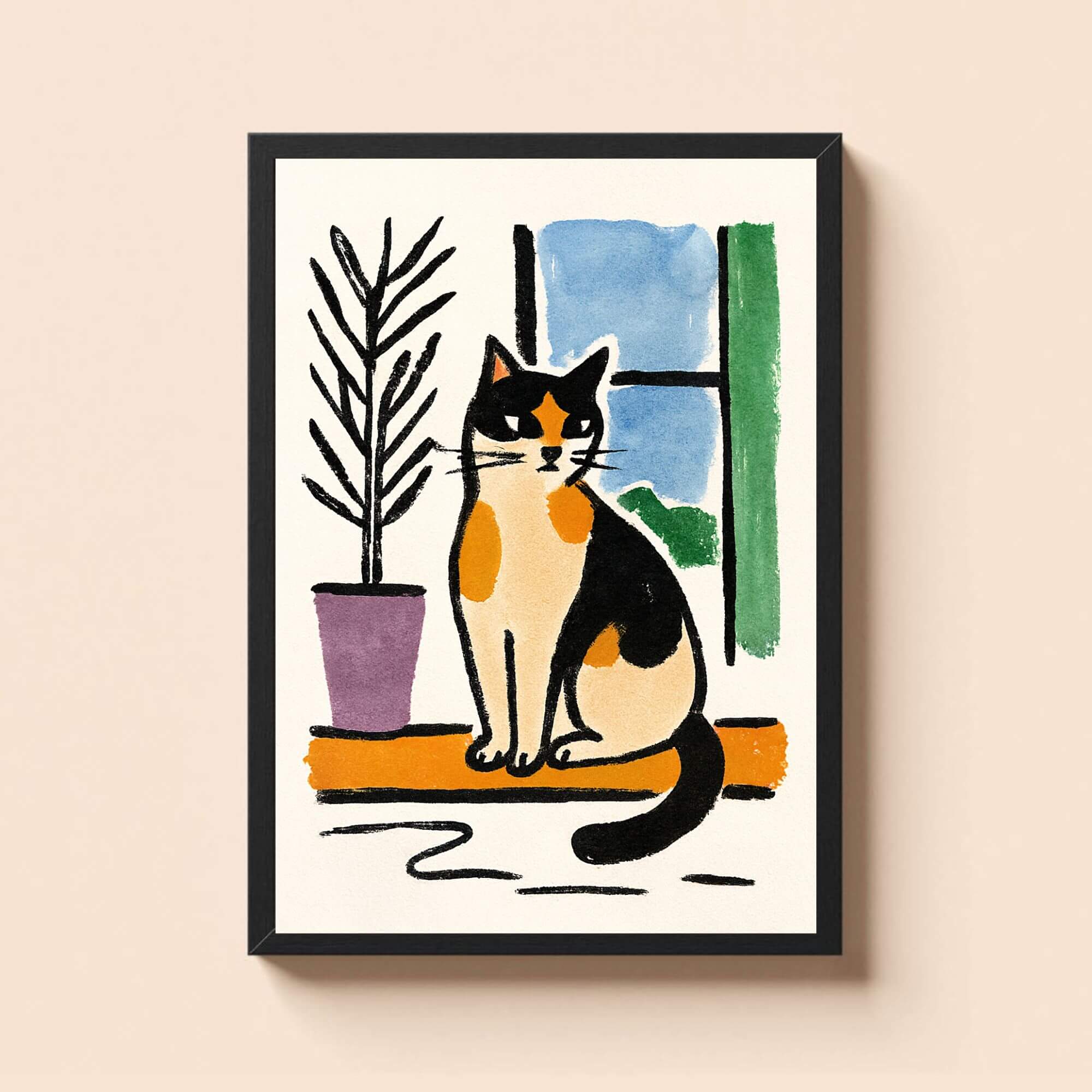 Calico Cat Wall Art – Cozy Window Scene Illustration, Bold Outline Cat Print for Pet Lovers, Minimalist Home Decor