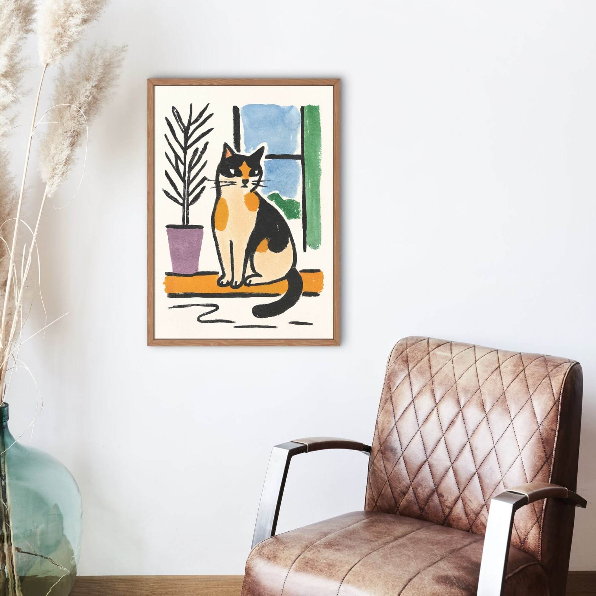 This charming calico cat wall art features a cozy window scene with bold black outlines that make a striking statement. The adorable calico cat peeks through the window, creating a warm and inviting atmosphere perfect for any cat lover’s home. The minimalist design with bold outlines adds a modern touch while capturing the playful personality of calico cats. Printed in crisp high-resolution quality, this digital artwork brings warmth and feline charm to your living space.
