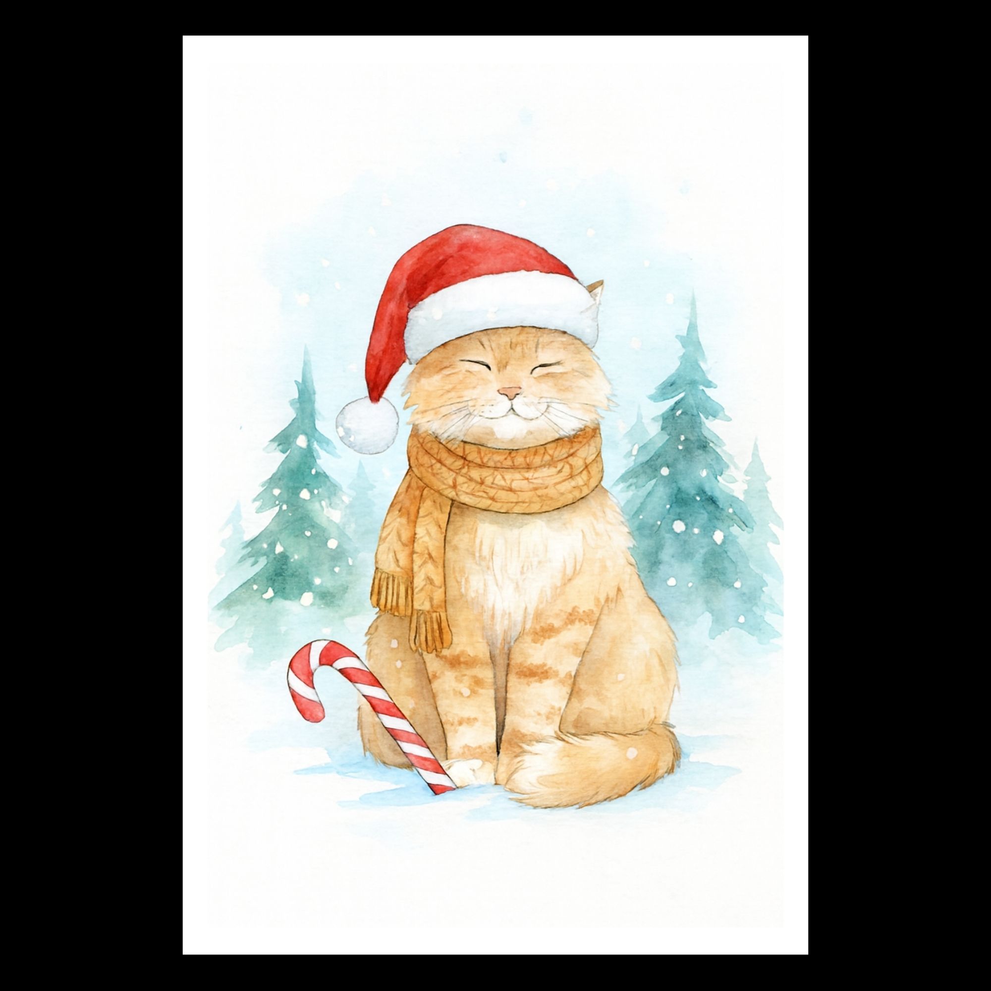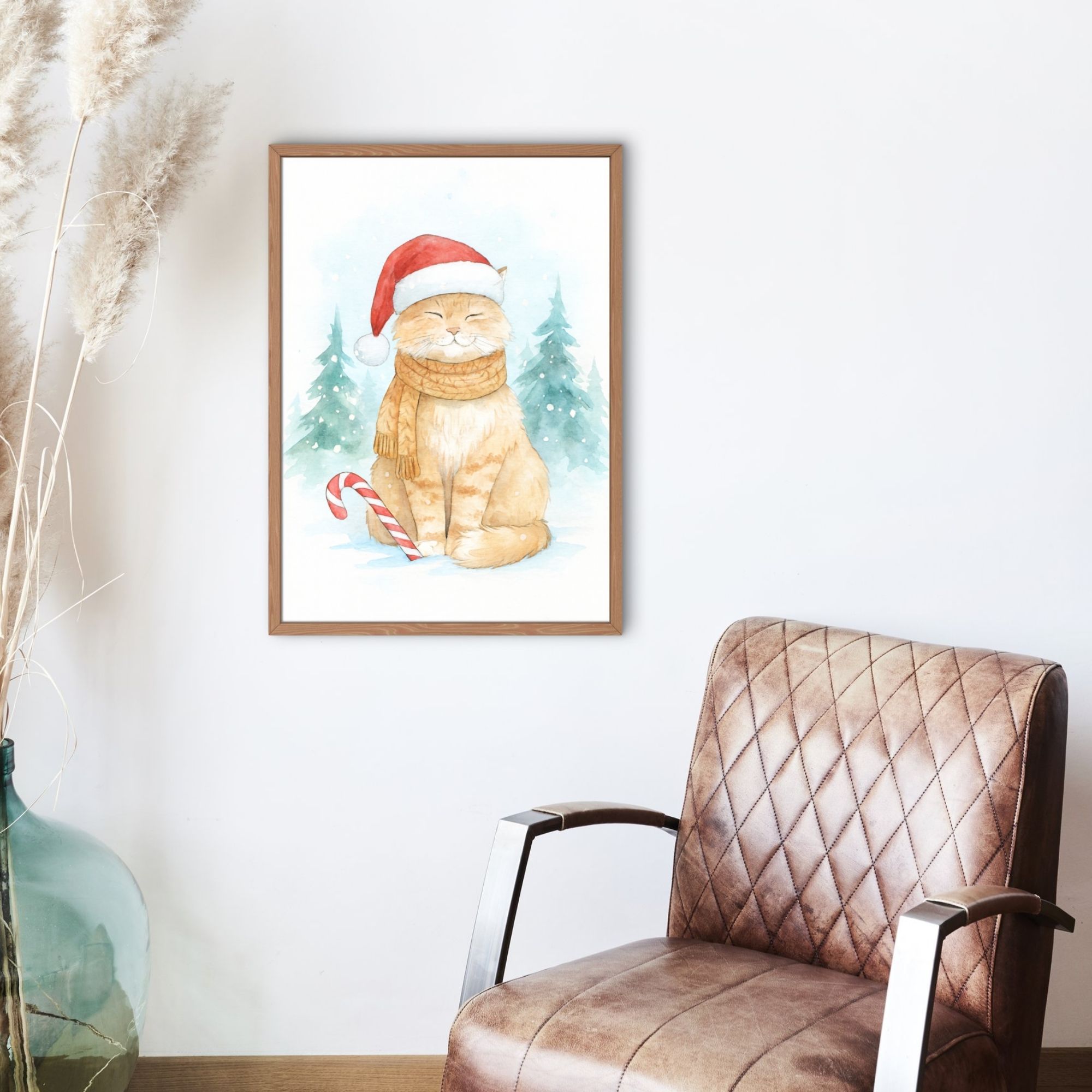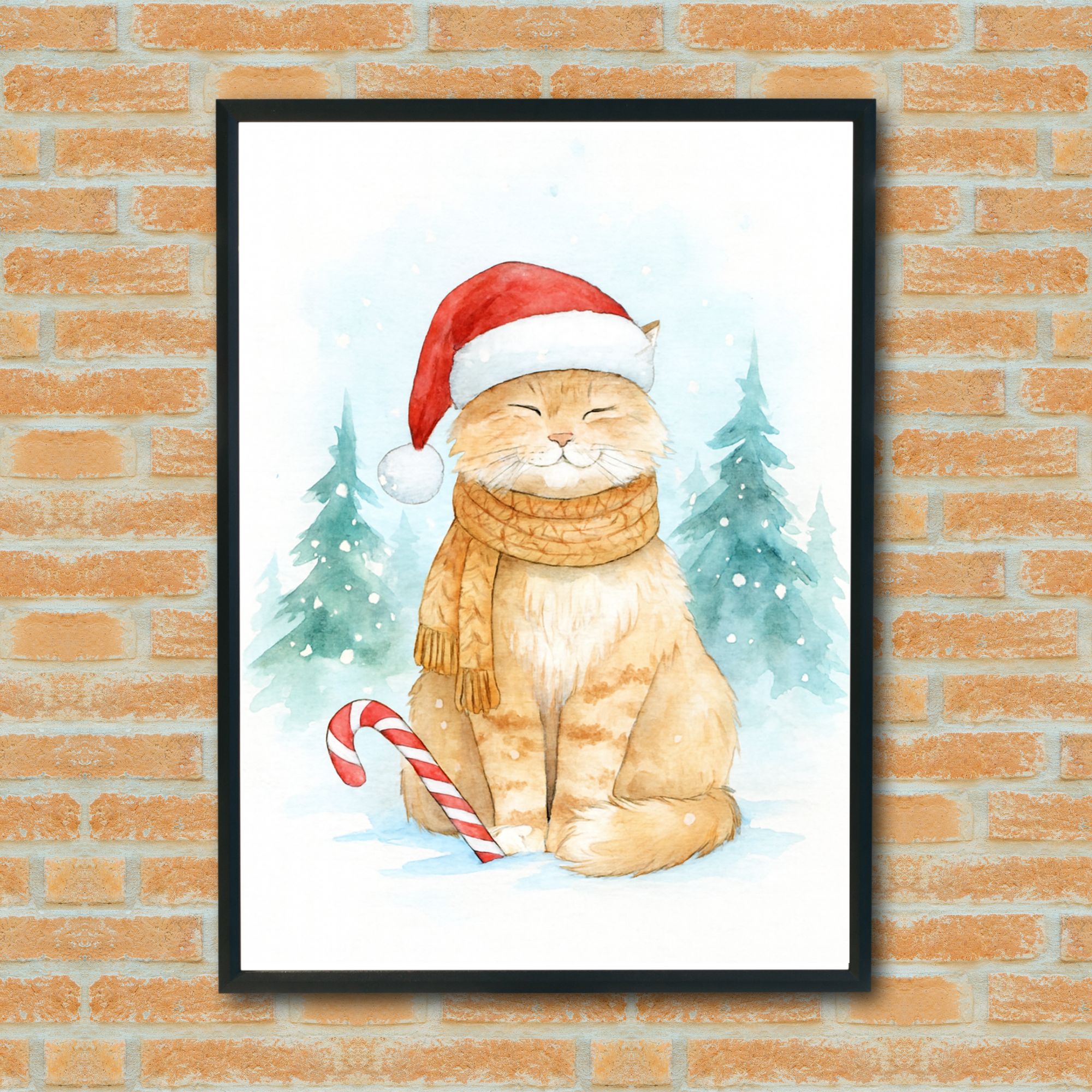 This charming watercolor Christmas cat artwork features an adorable feline wearing a classic Santa hat, surrounded by subtle holiday elements. Created with soft watercolor textures and festive colors, this digital print brings warmth and holiday spirit to any space. The playful illustration captures the perfect balance of feline curiosity and Christmas cheer, making it an ideal decoration for cat lovers during the holiday season. High-resolution files ensure beautiful printing results for your home, office, or as a thoughtful gift.
