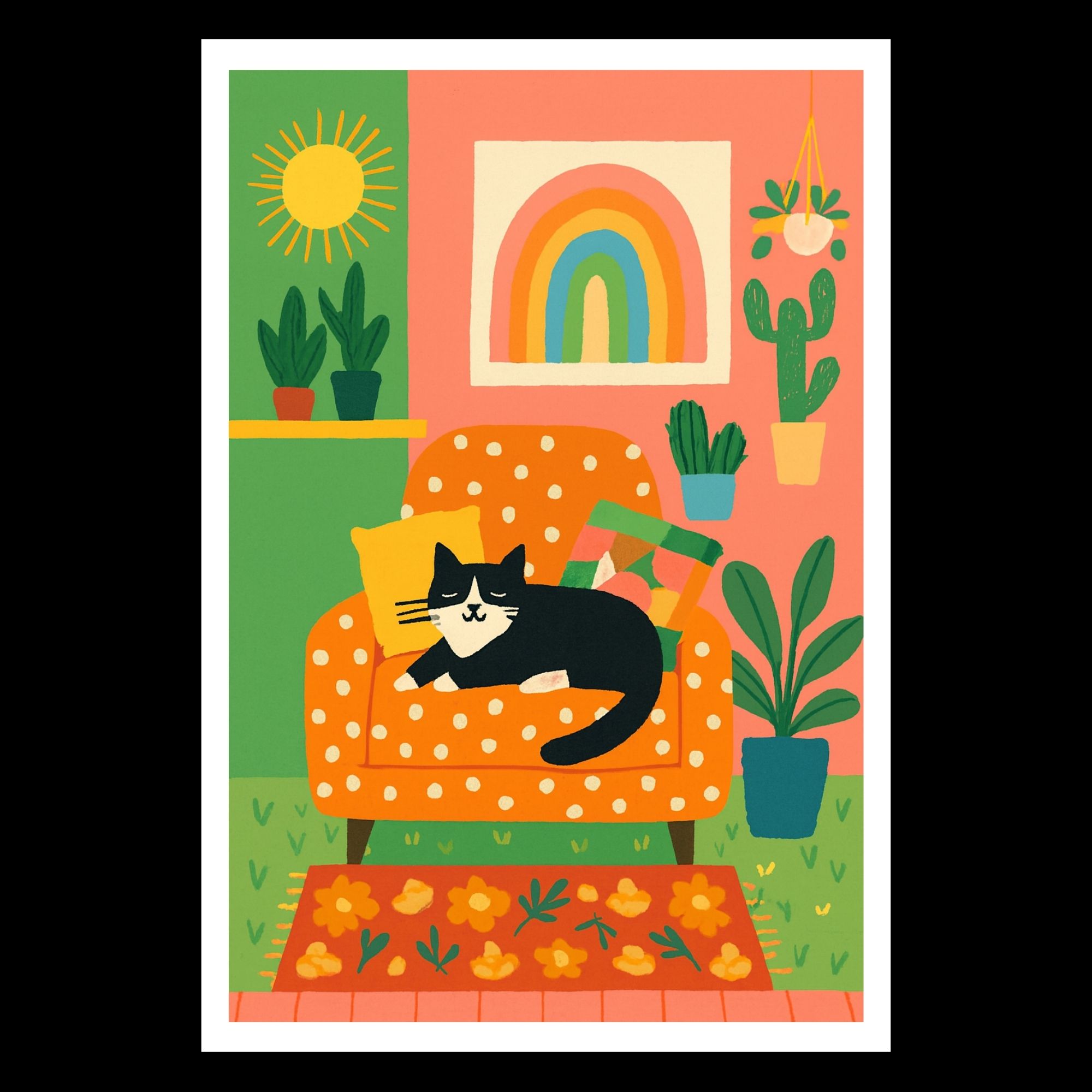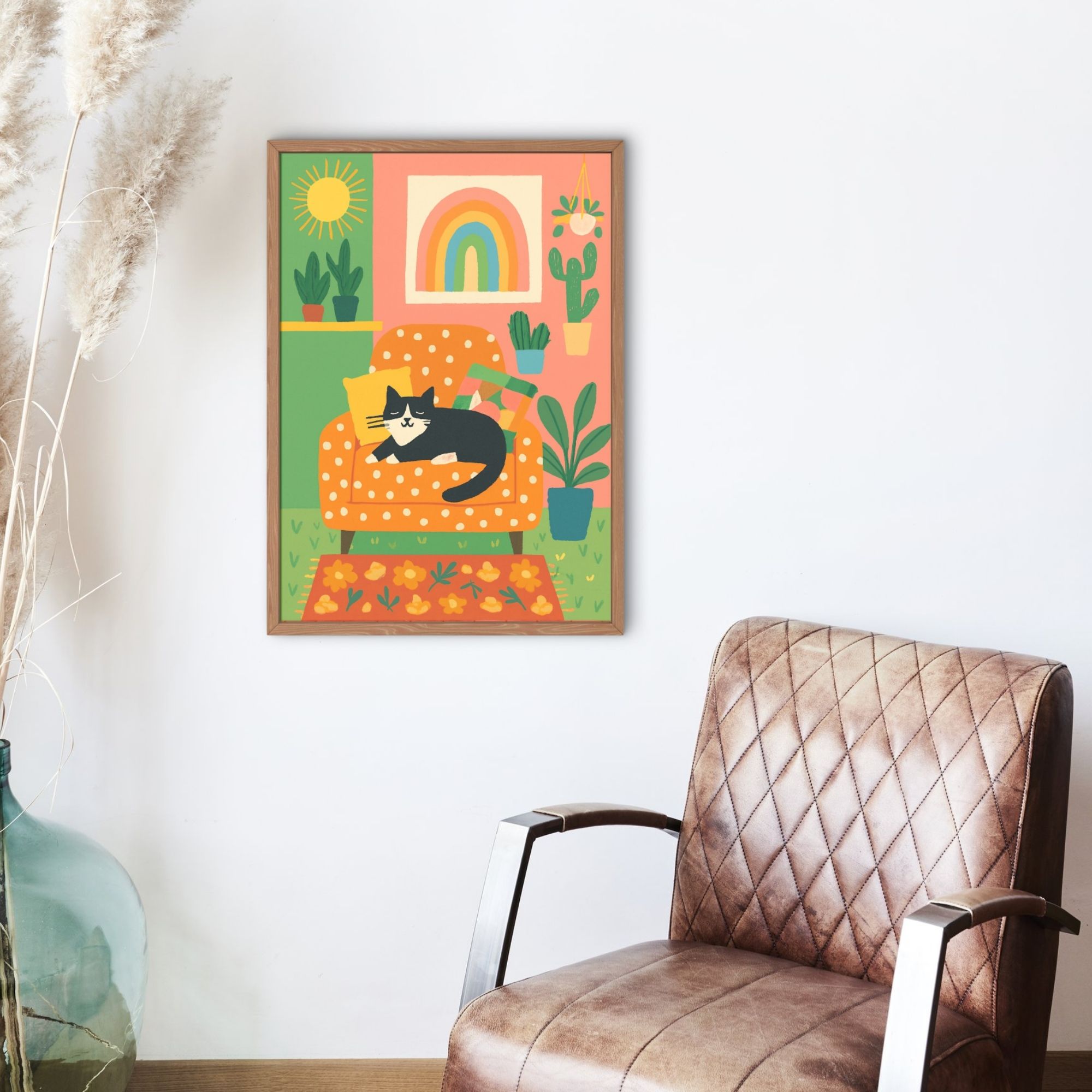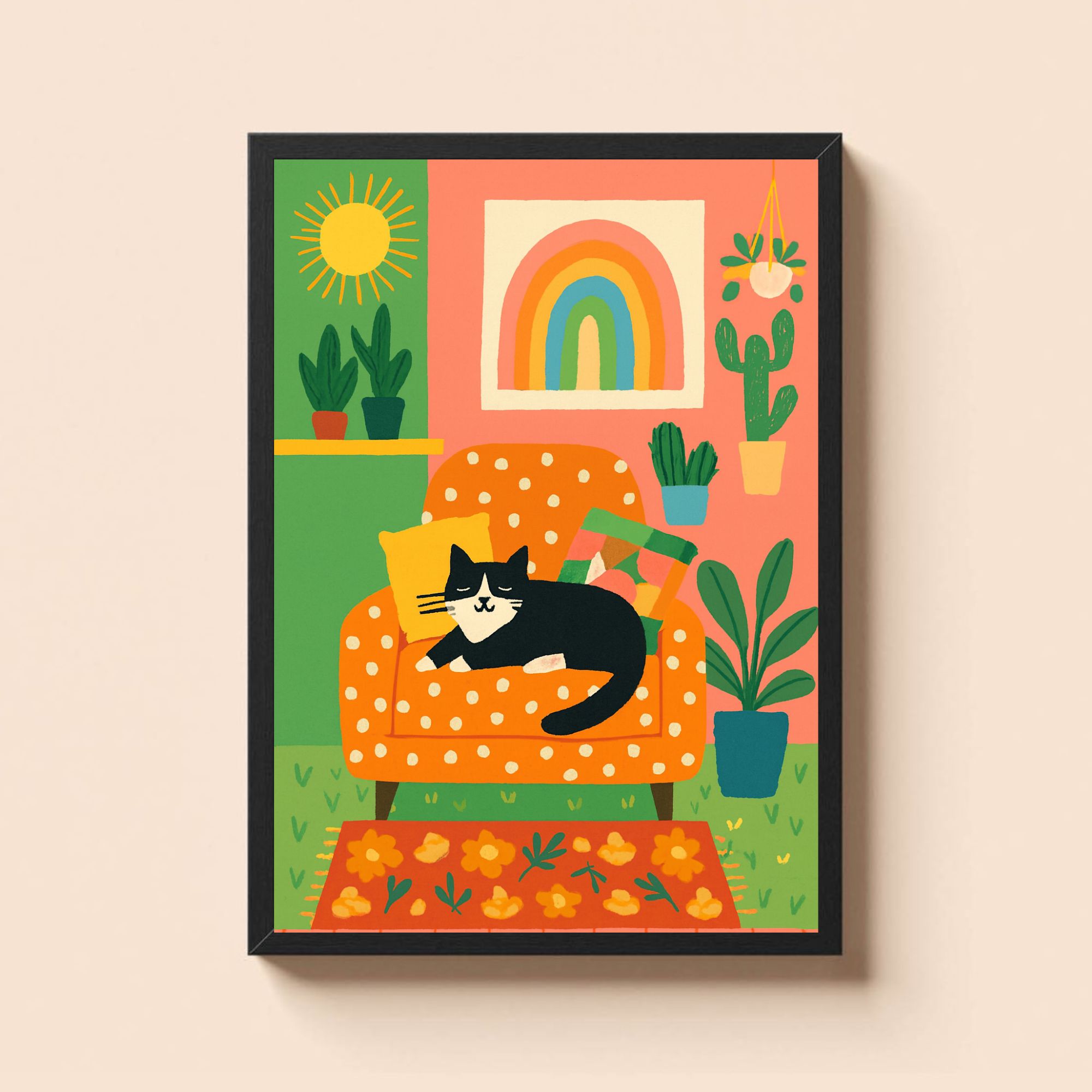 Cozy Cat Wall Art Print – Cute Black & White Cat on Orange Chair, Indoor Plant Decor, Rainbow Artwork, Boho Living Room Poster