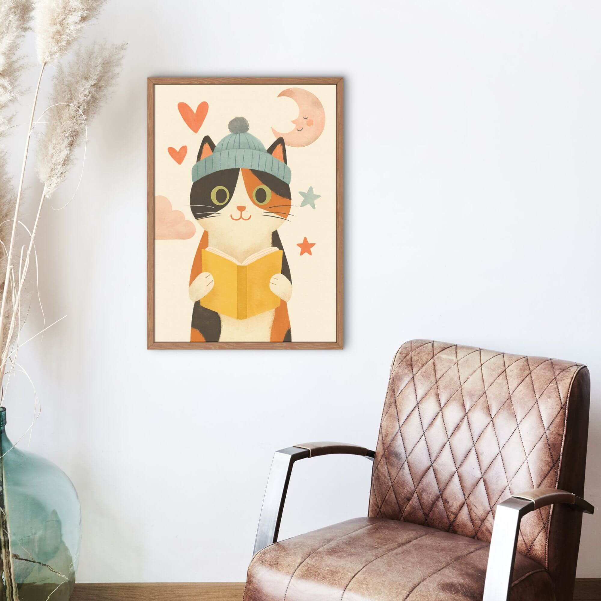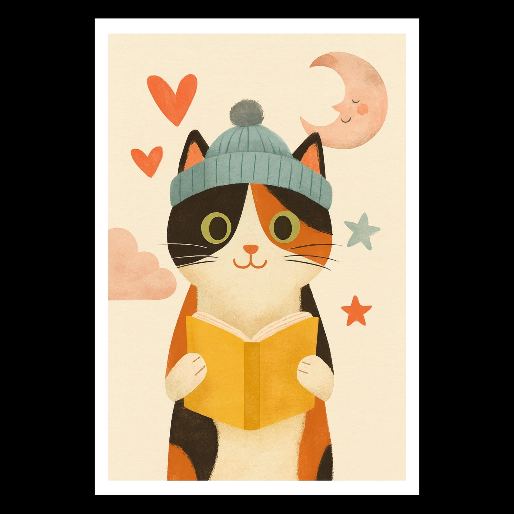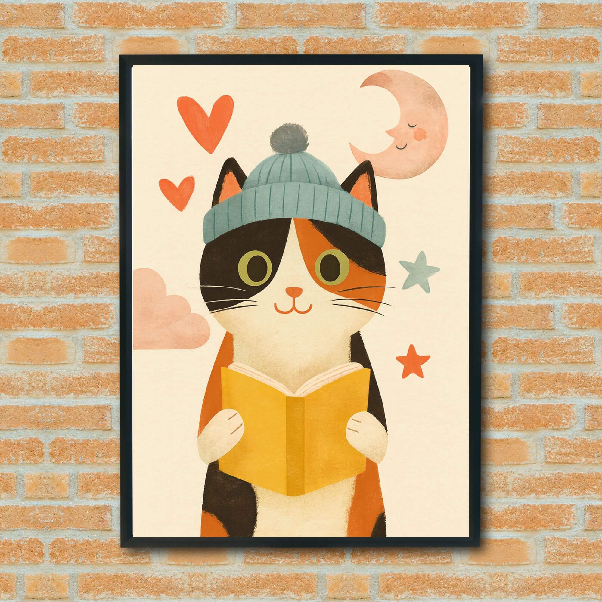 This charming whimsical calico cat reading poster features an adorable feline curled up with a book, creating the perfect cozy atmosphere for any child’s room or reading nook. The no-text design makes it versatile for various decor styles while promoting literacy and love for reading. With its soft colors and playful illustration, this 2:3 ratio wall art adds a touch of magic to nurseries, kids bedrooms, classrooms, and libraries.
